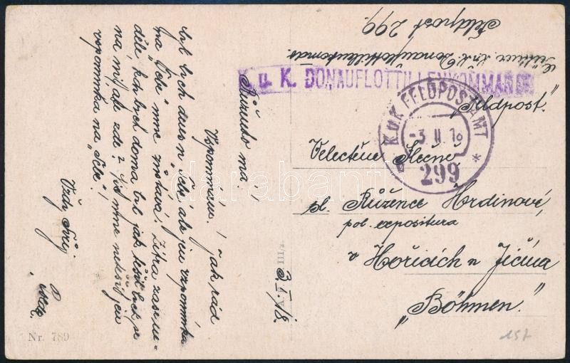 1918 Tábori posta képeslap "K.u.K. FELDPOSTAMT / b 299" , "K.u.K. DONAUFLOTTILLENKOMMANDO" az S.M.S. Sava legénységének egyik tagja által írt, Bécsbe címzett