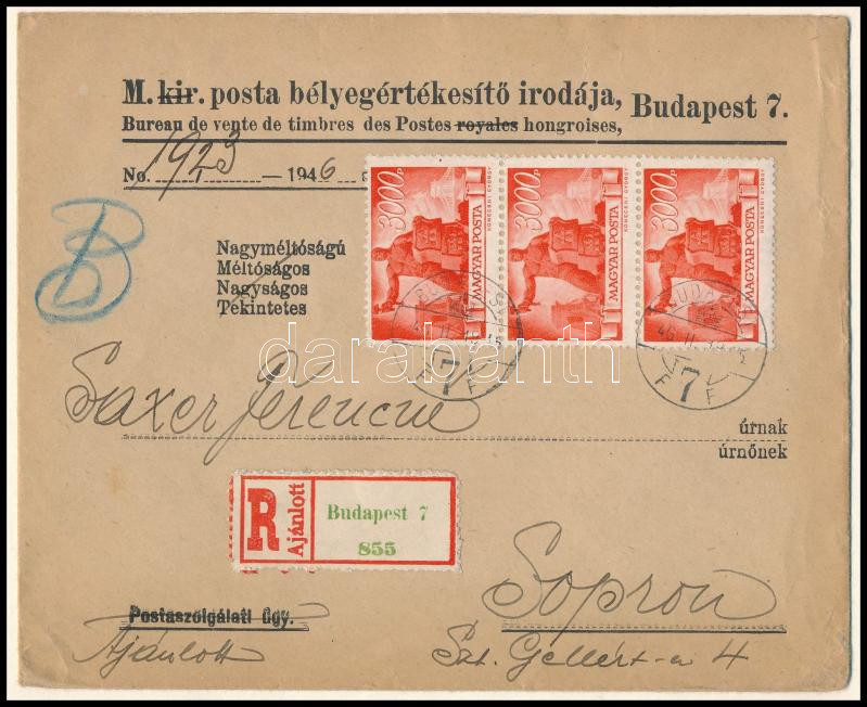Beschreibung: 1946 (7. díjszabás) Ajánlott levél Újjáépítés 3000P hármascsíkkal bérmentesítve Budapestről Sopronba