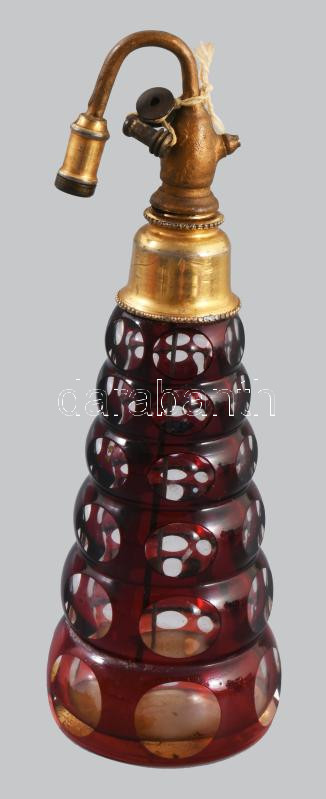 Beschreibung: Bíborpácolt cseh op-art parfümös üveg, m: 16,5 cm