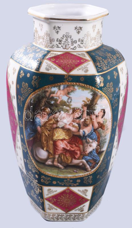 Beschreibung: Cseh Alt wien váza, mitológiai jelenettel, matricás, repedéssel. 32 cm