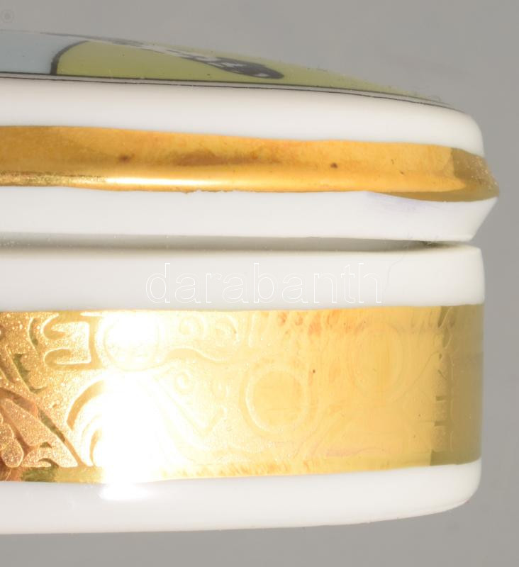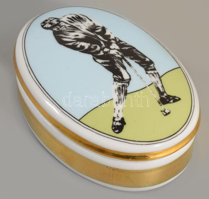 Hollóházi Faragó Miklós (1947- ) által tervezett golfozó mintás bonbon... https://www.darabanth.com/de/513-Auktion-Philatelie-Postkarten-Numismatik-Kunstwerke-Bucher-Schreibwaren-Schmuck/513.0/Porzellan-Keramik-Glass/Porzellan~78/Hollohazi-Farago-Miklos-1947-altal-tervezett-golfozo-mintas-bonbonier-Jelzett-hibatlan~II3465875