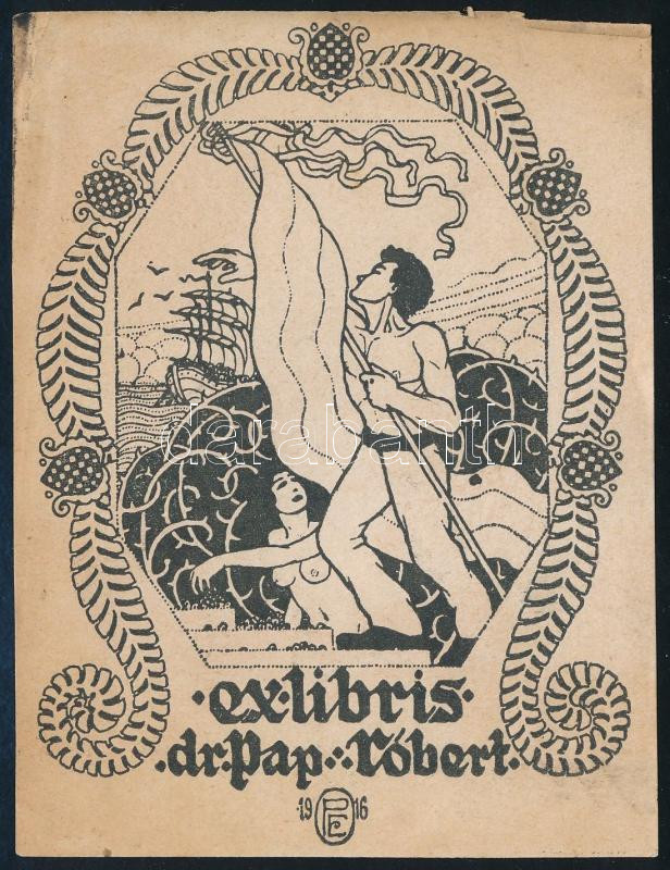 Petrovits Emil (1887-): Ex libris dr. Pap Róbert (szecessziós könyvjegy), 1916. Klisé, papír, jelzett a metszeten. Lapszéli apró szakadásokkal. 11,5x8,5 cm