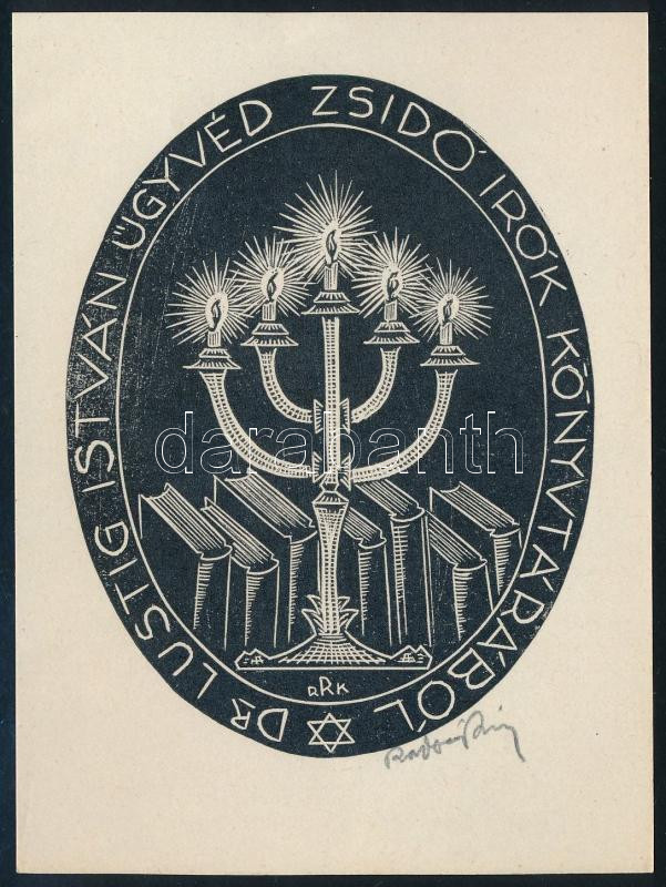 Radványi Román Károly (1900-1957): Zsidó írók könyvtárából, dr. Lustig István ügyvéd (judaika ex libris), 1935. Fametszet, papír, jelzett, hátoldalán a művész bélyegzőjével. 9,5x7,5 cm.