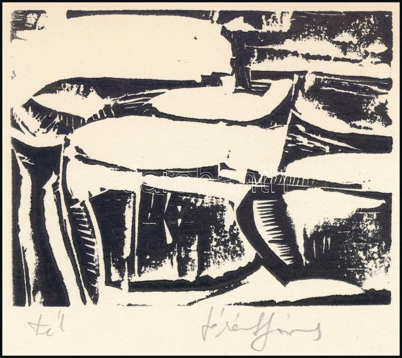 Beschreibung: Lóránt János Demeter (1938-): Tél. Linómetszet, papír, jelzett, 8×10,5 cm