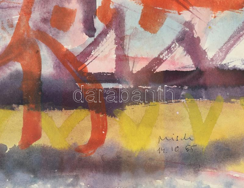 Misch Ádám (1935-1995): Út mentén (cím nélkül), 1965. Akvarell, papír, jelezve jobbra lent: Misch 14 10 65. 34x49 cm. Misch Ádám 1965-ben végzett az Iparművészeti Főiskolán, ezen alkotása az életmű egyik korai absztrakt darabja!! Üvegezett fakeretben. / Adam Misch (1935-1995): Along the road (untitled), 1965. Watercolour on paper, signed lower right. Framed. 34x49 cm.