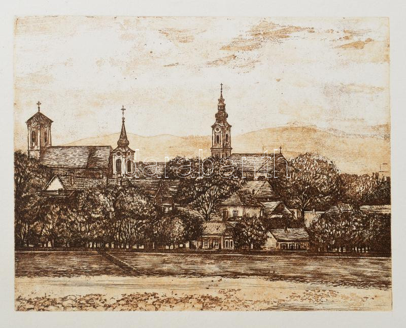 Beschreibung: Simon Zoltán (1950-): Szentendrei panoráma. Rézkarc, papír, jelzés nélkül, lap tetetjén paszpartuzás nyomaival, 17,5×23 cm