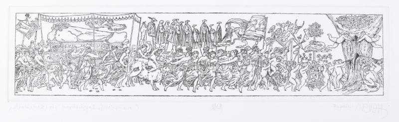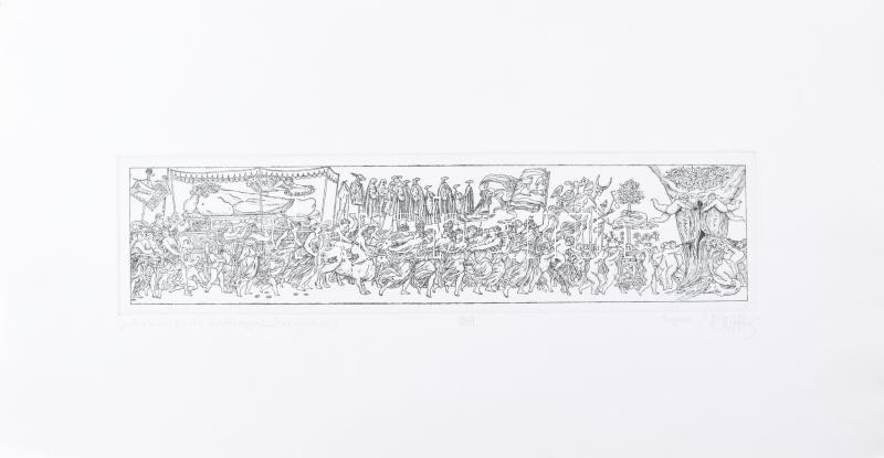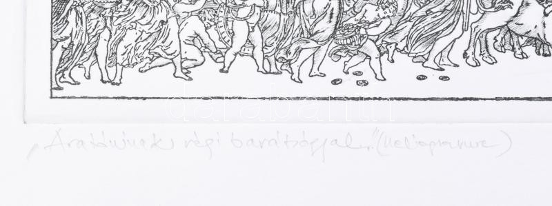 Beschreibung: Vén Zoltán (1941- ): Vonulás (cím nélkül). Heliogravűr, papír, jelzett, művészpéldány EA III/XX számozással, Vén Zoltán autográf ajánlásával, 9×35 cm