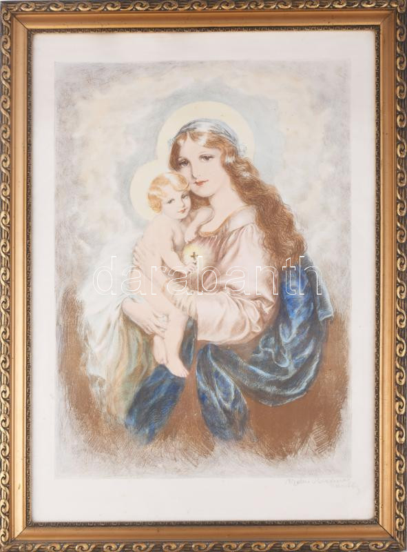 Beschreibung: Vydai Brenner Nándor (1903-1966): Mária a kisdeddel (Anya gyermekével). Litográfia, papír. Jelzett. Dekoratív, üvegezett fakeretben, 57x40 cm