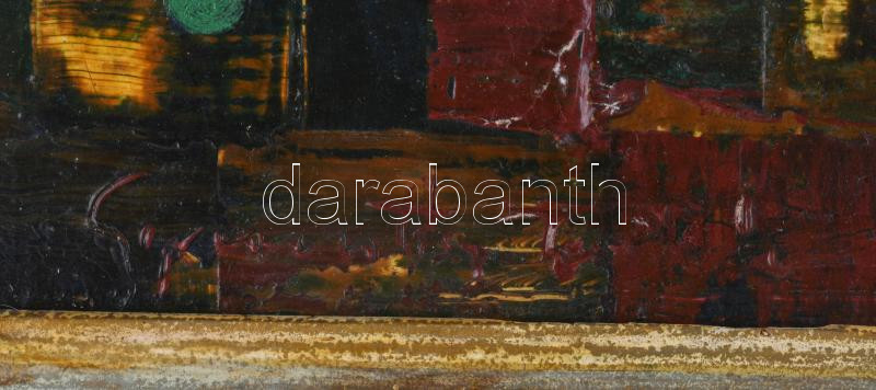 Beschreibung: Jelzés nélkül (Gyarmathy Tihamér?): Kompozíció. Olaj, farost. Hátoldalán Rádóczy Gyarmathy Gábor igazolásával. Sérült. Kopott fakeretben. 70x50 cm.