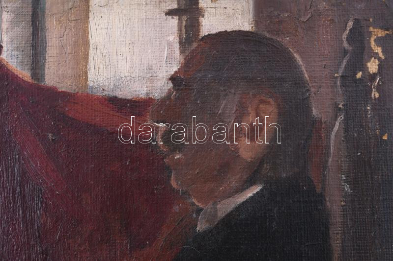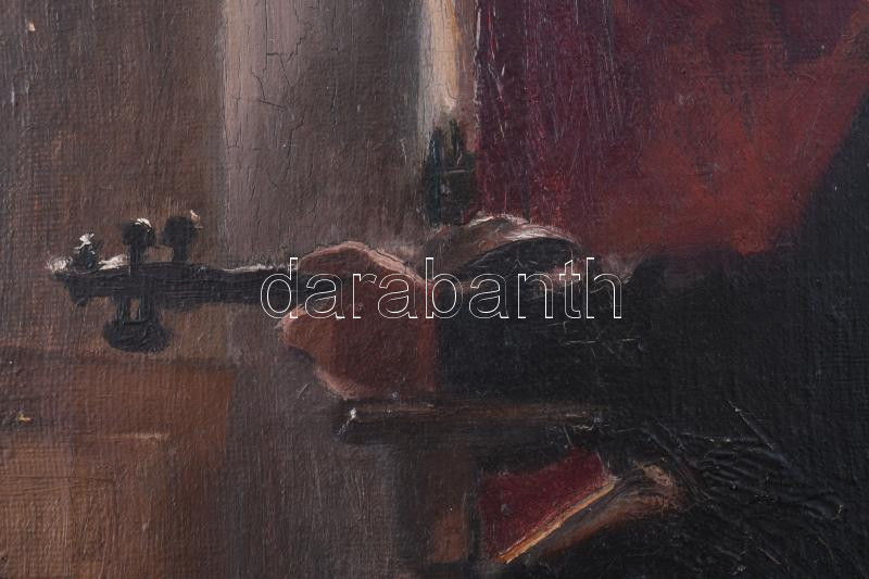 Jelzés nélkül, magyar festő, XX. sz. eleje: Férfi hegedűvel (műteremben, festményekkel). Olaj, vászon. Sérült. Proveniencia: Saphier-gyűjtemény. 31x29 cm