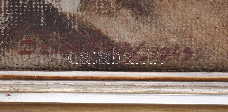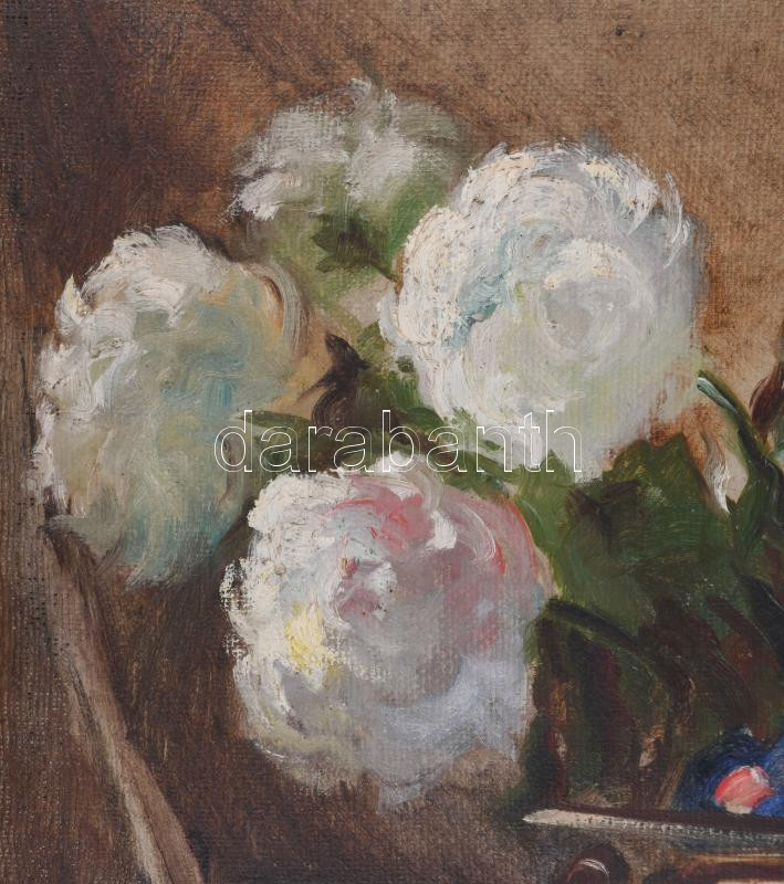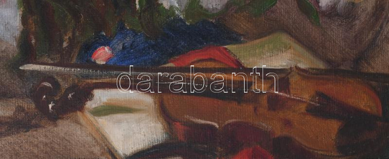 Olvashatatlan jelzéssel: Csendélet hegedűvel, 1943. Olaj, vászon. Sérült. Dekoratív, sérült fakeretben. 68,5x79 cm.