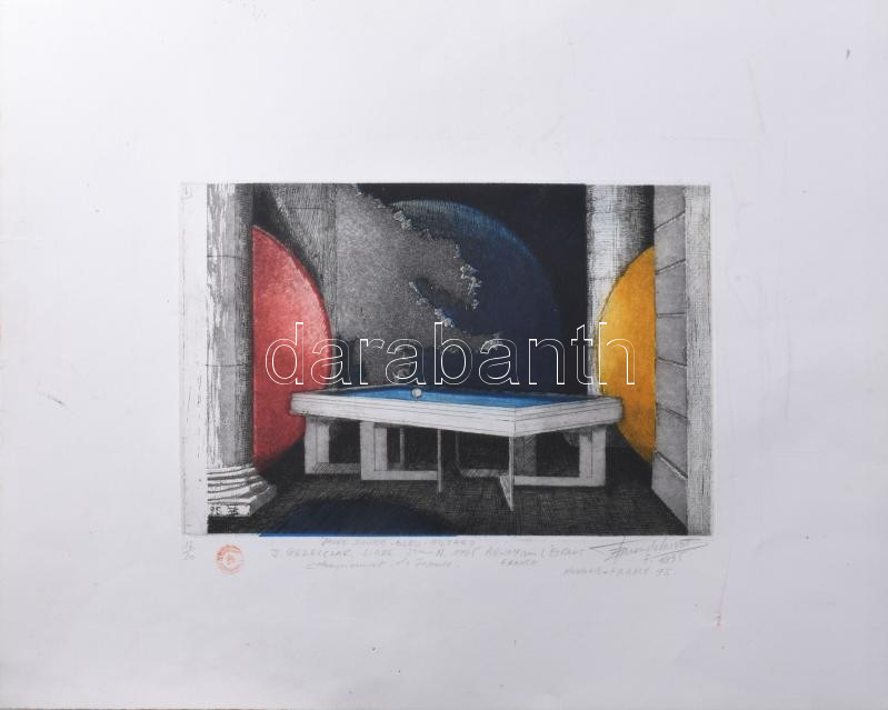 Olvashatatlan jelzéssel: Sárga-vörös-kék billiárd, 1995. Színes rézkarc, papír. Lapszéli elszíneződésekkel. 18,5x29 cm
