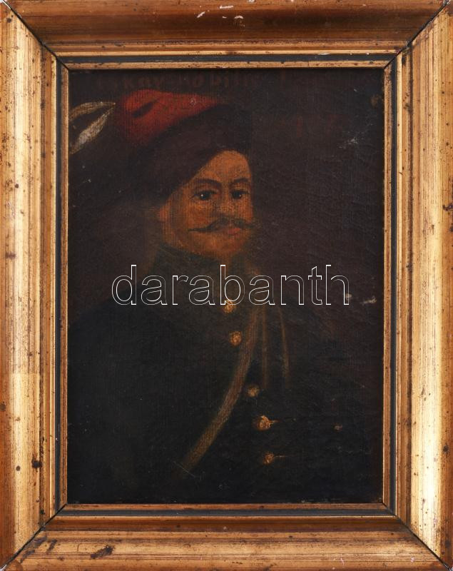 Olvashatatlan jelzéssel (?), XVIII. v. XIX. sz. festő: Magyar nemes portréja. Olaj, vászon. Tetején nehezen olvasható latin ny. felirattal és évszámmal. Javított. Apró felületi sérülésekkel. 20,5x15,5 cm. Dekoratív, kissé sérült fakeretben.