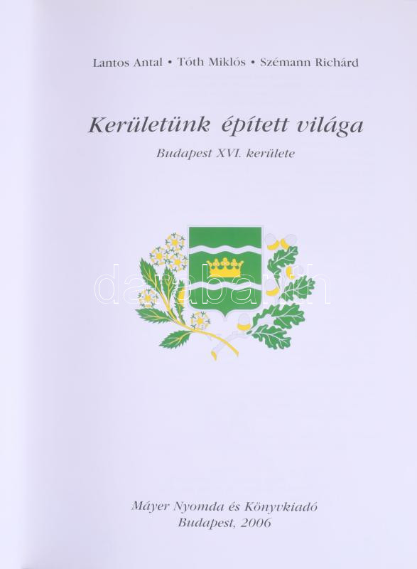 Lantos Antal, Tóth Miklós, Szémann Richárd: Kerületünk épÃtett világa - Budapest XVI. kerülete. Bp., 2006. Máyer Nyomda és Könyvkiadó. Kiadói kartonált papÃrkötés, kiadói papÃr védÅ‘borÃtóban
