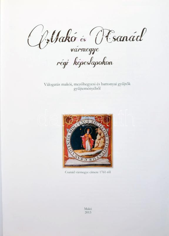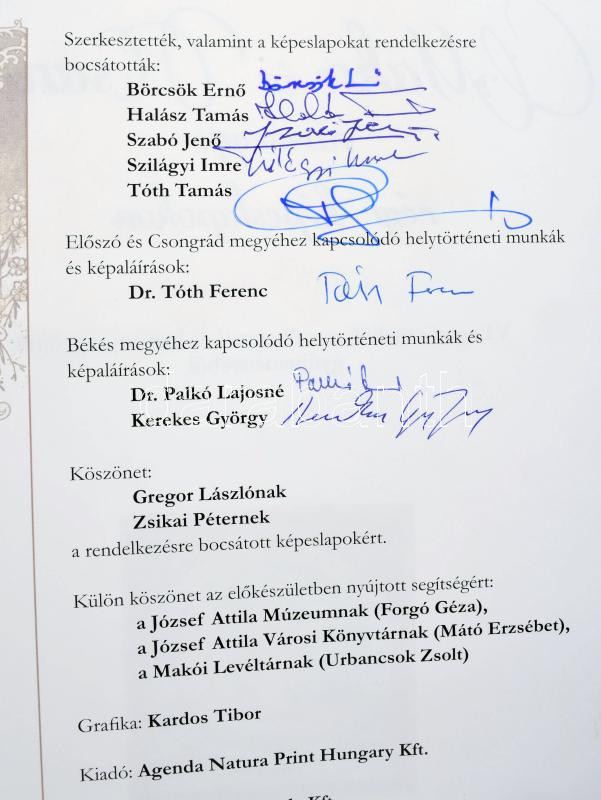 Makó és Csanád vármegye régi képeslapokon. Válogatás makói, mezőhegyesi és battonyai gyűjtők gyűjteményeiből. Makó, 2013, Agenda Natura Kft. 0027. számú példány. Kartonált papírkötés. A könyv szerkesztői és más készítői által (Börcsök Ernő, Halász Tamás, Szabó jenő, Szilágyi Imre, Tóth Tamás, Dr. Tóth Ferenc, Dr. Palkó Lajosné és Kerekes György) aláírt.
