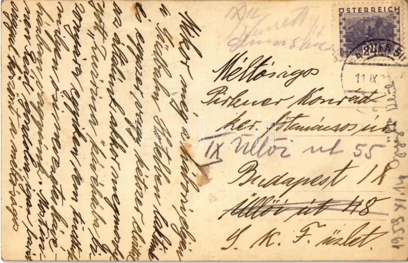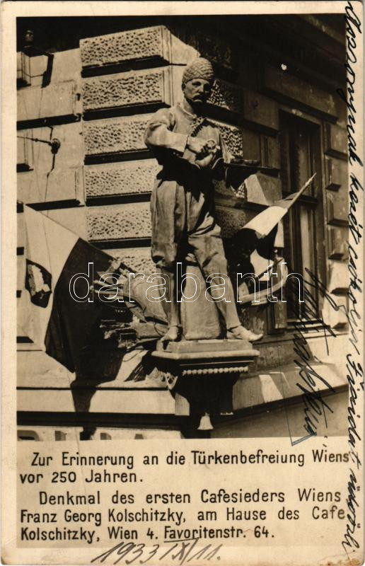1933 Wien, Vienna, Bécs; Zur Erinnerung an die Türkenbefreiung Wiens vor 250 Jahren. Denkmal des ersten Cafesieders Wiens Franz Georg Kolschitzky am Hause des Cafe Kolschitzky. Favoritenstr. 64. / In memory of the liberation of Vienna from the Turkish occupation 250 years ago. Monument to Vienna's first cafe owner, Franz Georg Kolschitzky, at the Cafe Kolschitzky building. photo (fa)