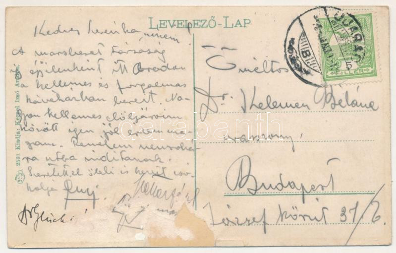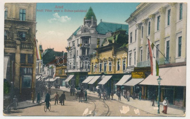 Arad, Atzél Péter utca, Bohus palota, Fehér Kereszt szálloda, üzletek, magyar zászlók. Kerpel Izsó kiadása / street view, palace, hotel, shops, Hungarian flags (ázott / wet damage)