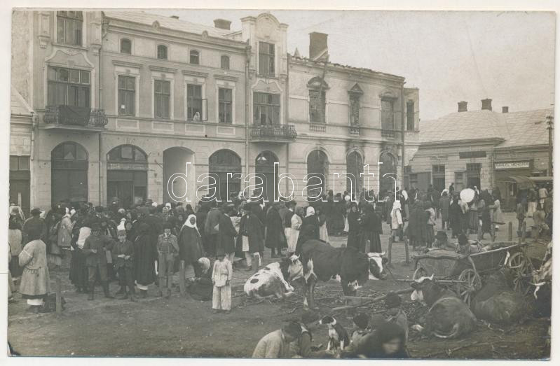 Beschreibung: Máramarossziget, Sighetu Marmatiei; Piac, állatvásár, szarvasmarhák, Samuel Menczer, Herman Picker, Rubinger üzlete / market, cattle, shops. photo