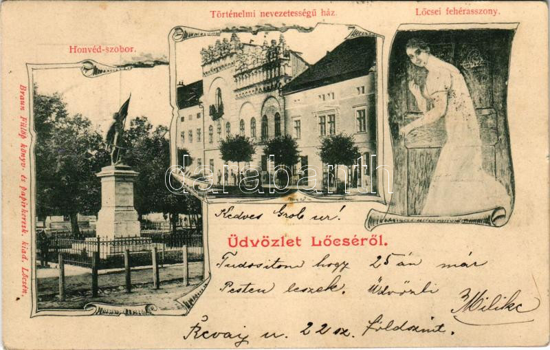 1902 Lőcse, Levoca; Honvéd szobor, történelmi nevezetességű ház, Lőcsei fehér asszony. Braun Fülöp kiadása / military monument, old house, White Lady. Art Nouveau, floral (fl)