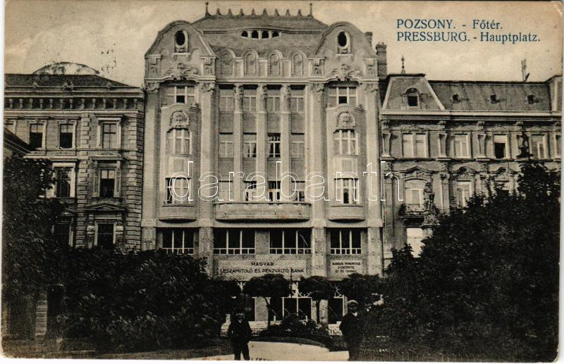 Beschreibung: 1912 Pozsony, Pressburg, Bratislava; Fő tér, Magyar Leszámítoló és Pénzváltó Bank. Kaufmann kiadása / Hauptplatz / main square, bank (EK)