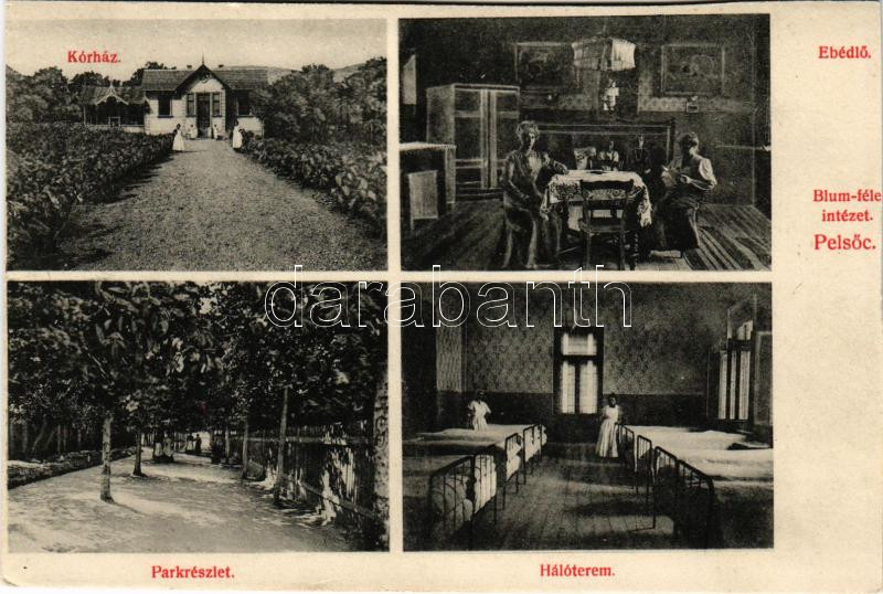 Pelsőc, Pelsőcz, Pelsücz, Plesivec (Gömör); Blum-féle ideggyógyintézet, hálóterem és ebédlő belső, park. Fuchs József kiadása / mental institution, psychiatric hospital, dormitory and dining hall interiors, garden (vágott / cut)