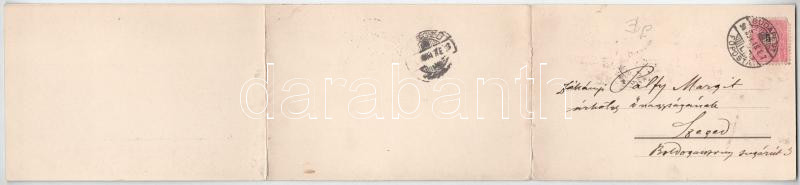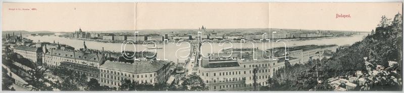 Beschreibung: 1898 Budapest, látkép a Gellérthegyről, Lánchíd, Bazilika, Parlament, gőzhajó. 3-részes kihajtható panorámalap. Stengel & Co. (Dresden) 4620. (hajtásnál kopott / worn at fold)