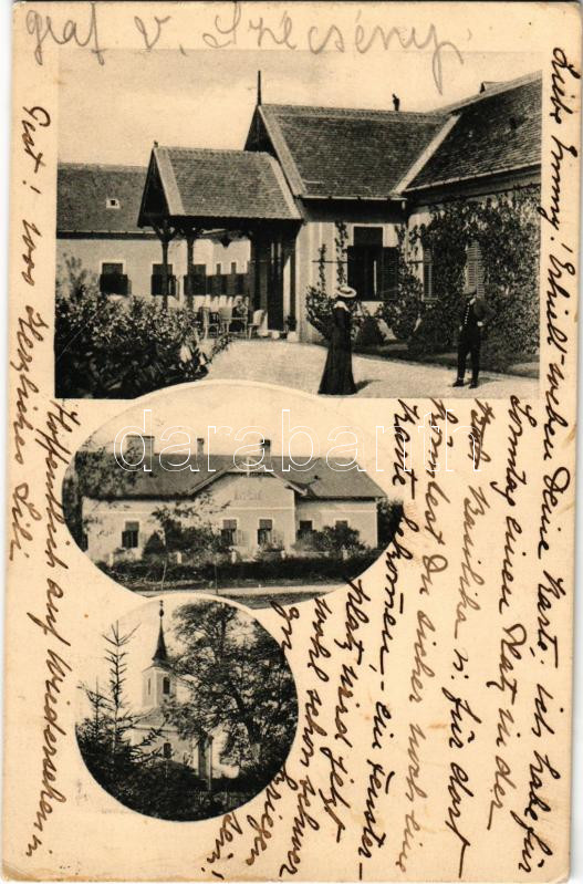 1906 Sárpentele, Sár-Pentele (Sárszentmihály); Széchenyi kúria, kastély, Kis-lak, templom. A képeslap címzettje báró Trauttenberg Frigyesné Almássy Emília (EK)