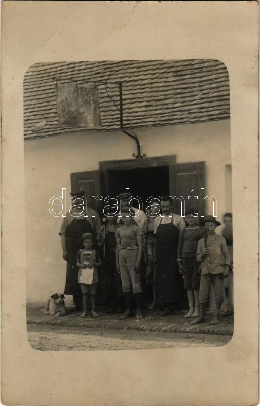 Beschreibung: 1913 Kecskemét, Burián Sándor kovácsmester üzlete, előtte a tulajdonos és családja. photo (gyűrődések / creases)