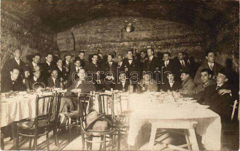 Beschreibung: 1922 Budapest XXII. Budafok, Pollak pince, belső italozó férfiakkal. photo