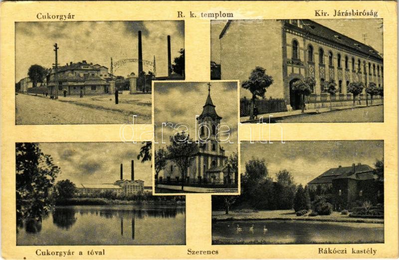 Beschreibung: 1948 Szerencs, Rákóczi kastély, Cukorgyár a halastóval, Cukorgyár bejárata, Kir. Járásbíróság, Római katolikus templom (EK)