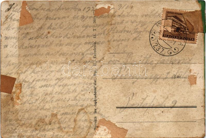 1953 Baranyajenő, mozaiklap: Földmívesszövetkezet terménygyűjtőtelepe, vegyeskereskedése, községháza, római katolikus templom, iskola. Horváth kiadása + "M.POSTA 237" vasúti mozgóposta bélyegző (b)