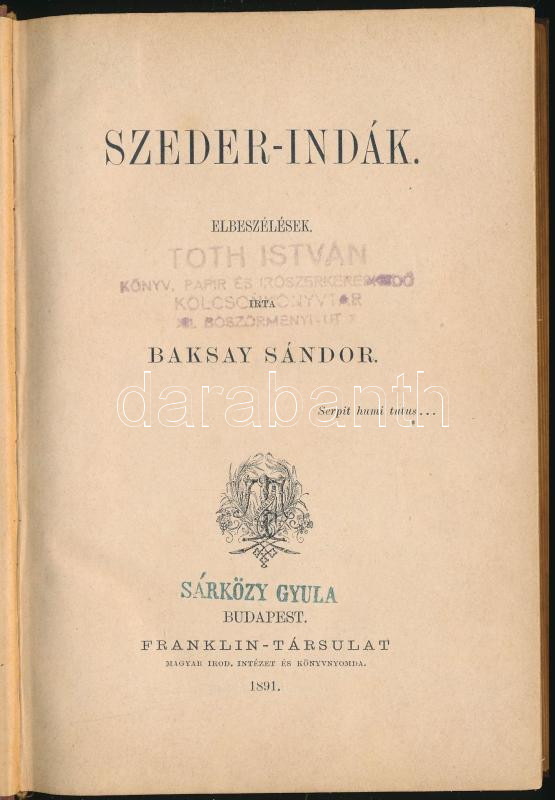 Baksay Sándor: Szeder-indák. Bp., 1891, Franklin. Kiadói festett, aran... https://www.darabanth.com/de/514-Auktion-Philatelie-Postkarten-Numismatik-Kunstwerke-Bucher-Schreibwaren-Schmuck/515.0/Bucher/Bucher-Andere-kuriositaten~633/Baksay-Sandor-Szeder-indak-Bp-1891-Franklin-Kiadoi-festett-aranyozott-egeszvaszon-kote~II3477636