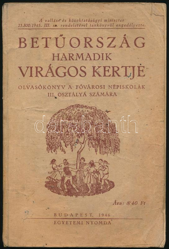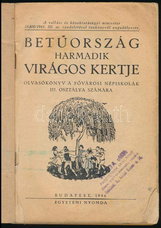 Betűország harmadik virágos kertje. Olvasókönyv a fővárosi népiskolák III. osztálya számára. Bp., 1946, Egyetemi Nyomda, 188 p. Kiadói papírkötés, viseltes borítóval, helyenként kissé foltos lapokkal.