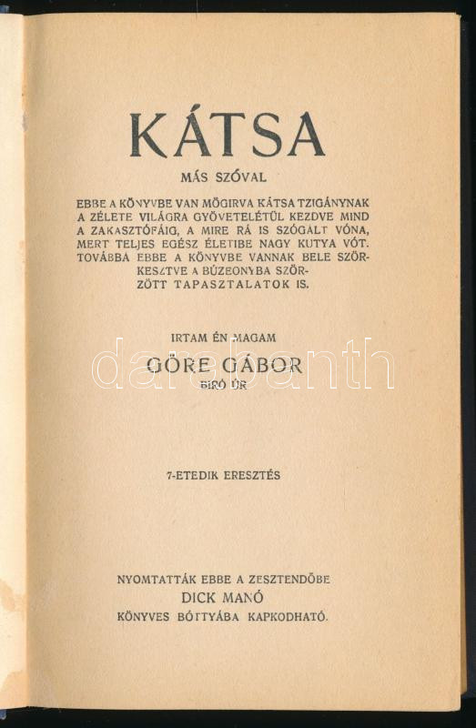 [Gárdonyi Géza] Göre Gábor: A Kátsa más szóval ebbe a könyvbe van mögirva Kátsa tzigány élete világra gyövetelétül kezdve mind a zakasztófáig, a mire rá is szógált vóna, mert teljes egész életibe nagy kutya vót. Továbbá itt vannak a búzeonyba szörzött tapasztalatok is. Írtam én magam - - bíró úr.