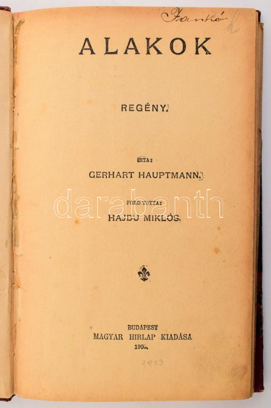 Gerhart Hauptmann: Alakok. Regény. Ford.: Hajdu Miklós. Bp.,1903, Magy... https://www.darabanth.com/de/514-Auktion-Philatelie-Postkarten-Numismatik-Kunstwerke-Bucher-Schreibwaren-Schmuck/515.0/Bucher/Bucher-Andere-kuriositaten~633/Gerhart-Hauptmann-Alakok-Regeny-Ford-Hajdu-Miklos-Bp-1903-Magyar-Hirlap-131-p-Atkotot~II3409229
