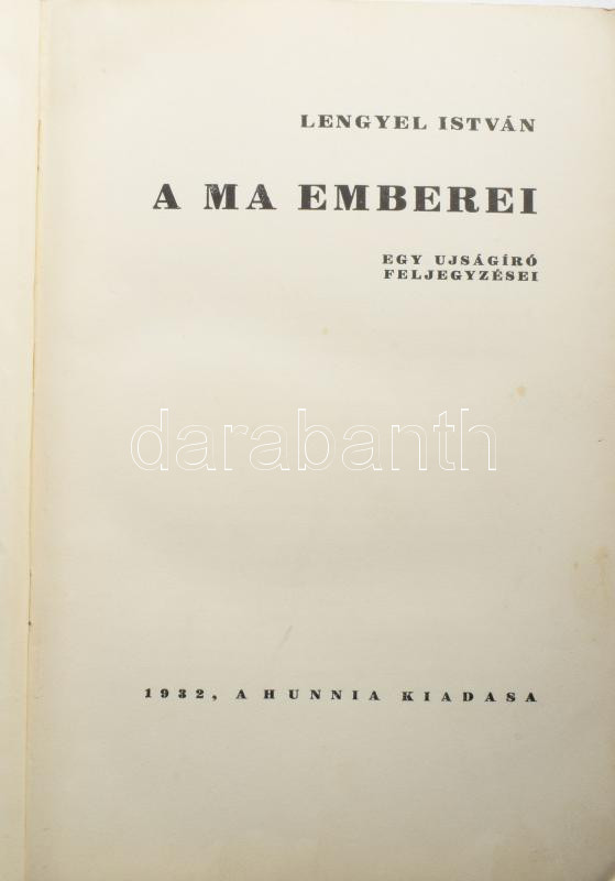 Lengyel István: A ma emberei. Egy újságíró feljegyzései. A szerző, Lengyel István (1892-1970) újságíró, lapszerkesztő, író, költő által dedikált példány (,,Kovács Emil igazgató úrnak, szeretettel és nagyrabecsüléssel Lengyel István"). [Bp.], 1932, Hunnia, 212+[4] p. Kiadói egészvászon-kötés, viseltes, ázott borítóval, néhány kissé foltos lappal.