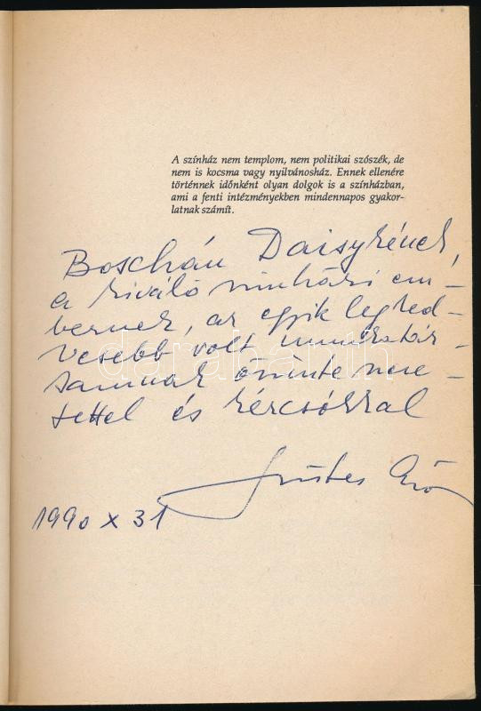 Szirtes György: Színház a Broadway-n. A szerző, Szirtes György által Boschán Daisy (1942- ) koreográfus, operarendező részére dedikált példány. (Bp., 1990), Népszava. Kiadói papírkötés.