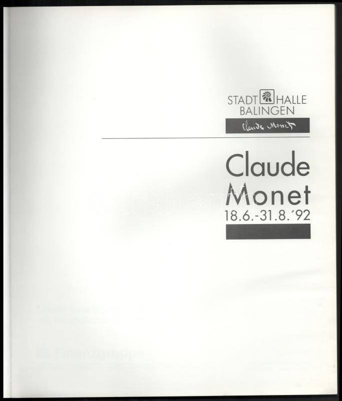 Claude Monet. (Kiállítási katalógus.) Balingen, 1992, Stadthalle Balin... https://www.darabanth.com/de/514-Auktion-Philatelie-Postkarten-Numismatik-Kunstwerke-Bucher-Schreibwaren-Schmuck/515.0/Bucher/Bucher-Architektur-Kunst~619/Claude-Monet-Kiallitasi-katalogus-Balingen-1992-Stadthalle-Balingen-Fekete-feher-es-szC3~II3477574