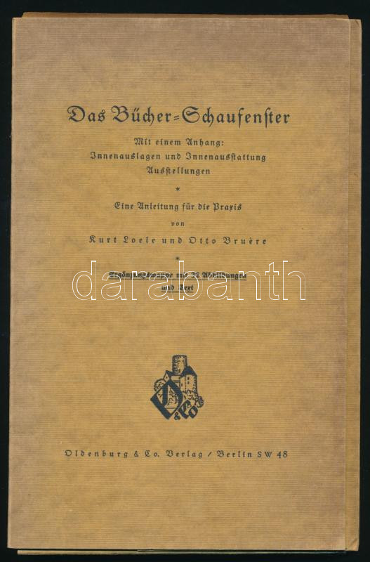 Das Bücher-Schaufenster. Mit einem Anhang: Innenauslagen und Innenausstattung, Ausstellungen. Eine Anleitung für die Praxis von Kurt Loele und Otto Bruere. Ergänzungsmappe mit 32 Abbildungen und Text. Berlin, [1921], Oldenburg & Co., 19+(1) p.+ 34 (fekete-fehér képek) t. Német nyelven. Kiadói mappában.