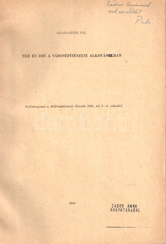 Granasztói Pál (1908-1985) Ybl-díjas építészmérnök, urbanisztikai szakértő. Történeti urbanisztikai cikkét Európa történeti városmagjaiból vett szövegközti fotóanyag illusztrálja. Az első borítófedélen hagyatéki bélyegzés, "Zádor Anna hagyatékából" felirattal.