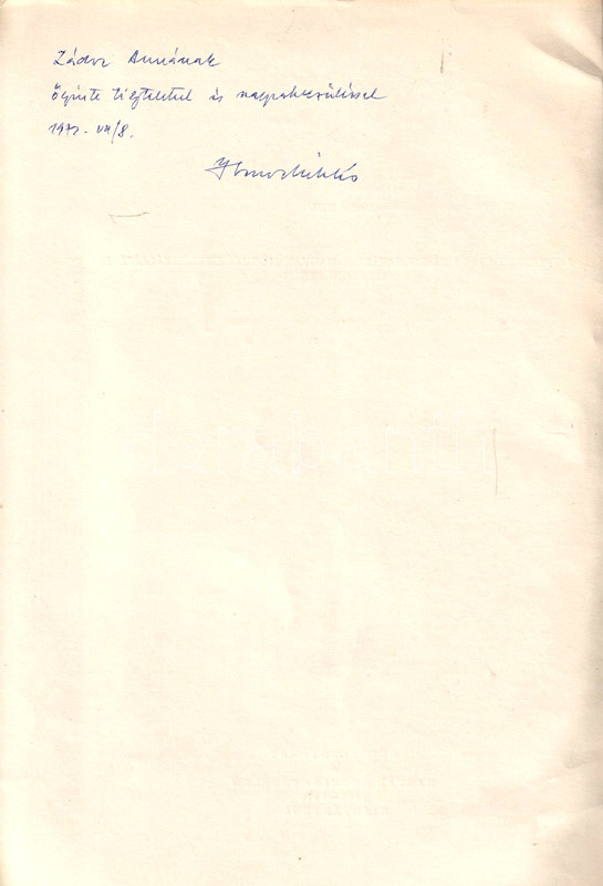 Dedikált: "Zádor Annának őszinte tisztelettel és nagyrabecsüléssel: Horler Miklós. 1972 VII/8".