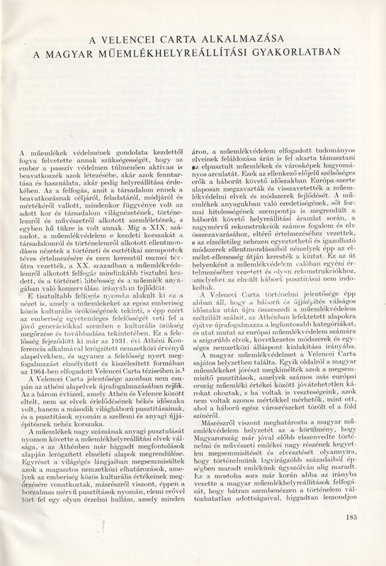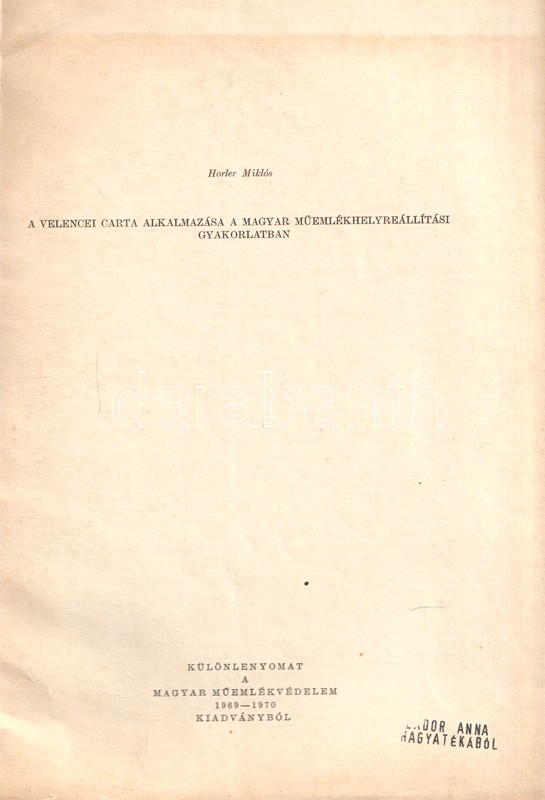 A Velencei Carta alkalmazása a magyar műemlék-helyreállítási gyakorlatban. (Dedikált.)