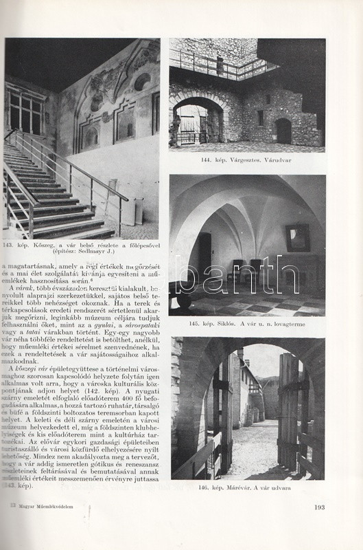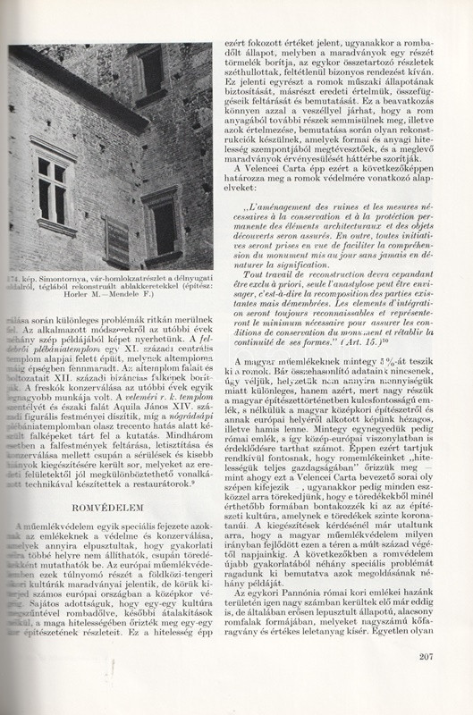 Horler Miklós (1923-2010) építész, műemlékvédelmi szakíró, az Országos Műemlékvédelmi Felügyelőség tudományos igazgatója, a budai Nagyboldogasszony-templom kórusának karnagya. A budai várnegyed, a simontornyai vár, az esztergomi Bakócz-kápolna helyreállításának szakértője, Szentendre, Sárospatak történelmi városmagja rekonstrukciójának műemlékvédelmi szakértője. Tanulmányában az 1964-ben elfogadott nemzetközi műemlékvédelmi egyezmény, a Velencei Charta elveiből kiindulva elemzi az elmúlt évtizedek magyar műemlékvédelmi tevékenységét. A szövegközti fotóanyagon megelevenednek Sopron, Kőszeg, Csempeszkopács, Nagyvázsony, Veszprém, Visegrád, Simontornya, a budai Várnegyed, Mátraverebély és Sárospatak rekonstrukciós munkálatai. Az első borítófedélen hagyatéki bélyegzés, "Zádor Anna hagyatékából" felirattal.