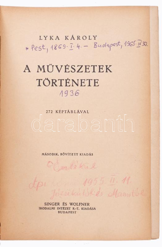 Lyka Károly: A művészetek története. 272 képtáblával Bp., 1939, Singer... https://www.darabanth.com/de/514-Auktion-Philatelie-Postkarten-Numismatik-Kunstwerke-Bucher-Schreibwaren-Schmuck/515.0/Bucher/Bucher-Architektur-Kunst~619/Lyka-Karoly-A-muveszetek-tortenete-272-keptablaval-Bp-1939-Singer-es-Wolfner-2-kiad~II3460636