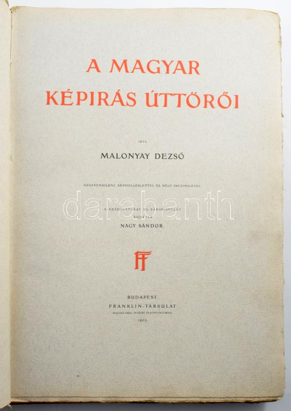 Malonyai Dezső: A magyar képírás úttörői. Negyvenkilenc képmelléklettel és négy facsimilével. A kezdőlapokat és záródíszeket rajzolta Nagy Sándor. Bp. 1905. Franklin Társ. 4 sztl. lev. 120 l. 49 t. Sérült félvászon kötésben, gerinc hiányzik