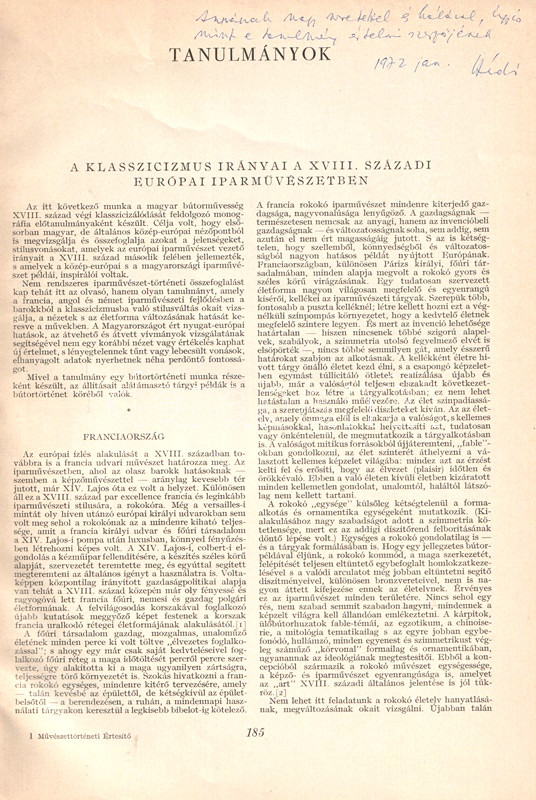 Prov.: Zádor Anna. [Zádor Anna (1904-1995) művészettörténész, műemlékvédő, egyetemi tanár, szerkesztő, fő kutatási területe a klasszicizmus és romantika művészettörténete és történeti építészete.)