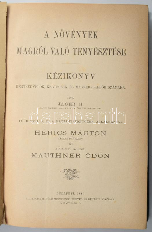 Jäger, H[ermann]: A növények magról való tenyésztése. Kézikönyv kertkedvelők, kertészek és magkereskedők számára. Fordították és a hazai viszonyokra alkalmazták: Hérics Márton és Mauthner Ödön. Bp., 1889, Deutsch M.-féle Műintézet Czettel és Deutsch, [8] + 460 + [2] p. Fekete-fehér ábrákkal illusztrálva. Kiadói aranyozott egészvászon-kötés, márványozott lapélekkel, kissé kopott borítóval, a gerincen kis sérülésekkel, szakadt elülső szennylappal.