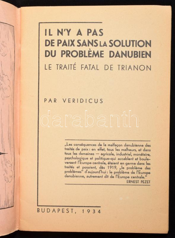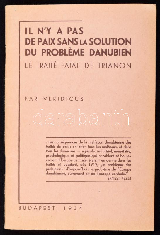 [A trianoni béke kritikájáról szóló francia nyelvű munka] Il n'y a pas de paix sans la solution de probleme Danubien. Le traité fatal de Trianon. Par Verdicus. Bp., 1934. 64p. térképekkel. Kiadói papírkötésben