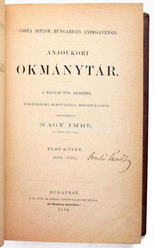 Deák Farkas: A Wesselényi család őseiről. Hozzákötve: Nagy Imre (szerk.): Anjoukori okmánytár. I. köt. (1301-1321.) Magyar Történelmi Emlékek. Bp., 1878, MTA (Athenaeum-ny.), 50 p.+ 3 t.; IV+656 p. (A két mű közé bekötve egy hozzájuk nem tartozó címlap.) Egészvászon-kötésben, nagyrészt jó állapotban.