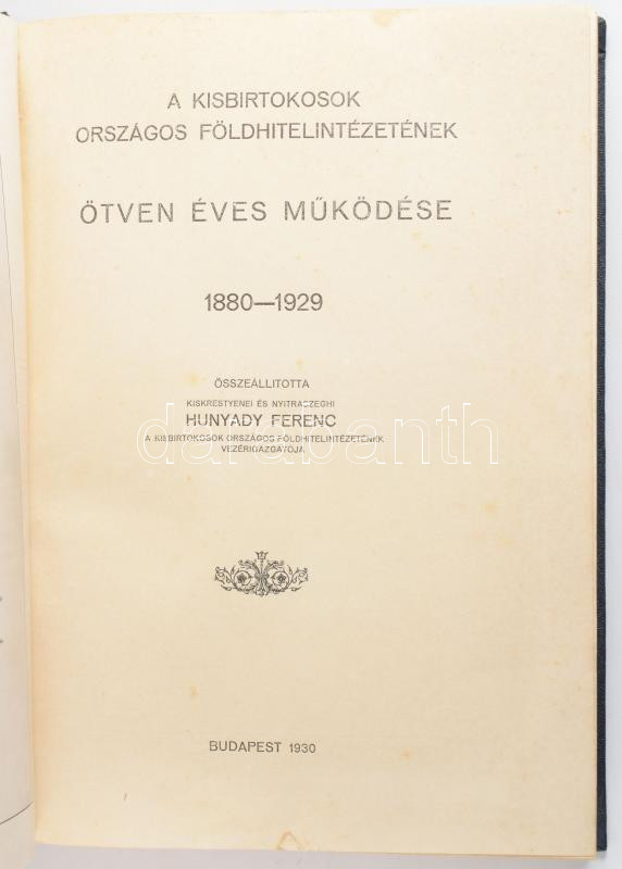 Hunyady Ferenc: A Kisbirtokosok Országos Földhitelintézetének ötven év... https://www.darabanth.com/de/514-Auktion-Philatelie-Postkarten-Numismatik-Kunstwerke-Bucher-Schreibwaren-Schmuck/515.0/Bucher/Bucher-Geschichte~617/Hunyady-Ferenc-A-Kisbirtokosok-Orszagos-Foldhitelintezetenek-otven-eves-mukodese-1880-1929~II3460944